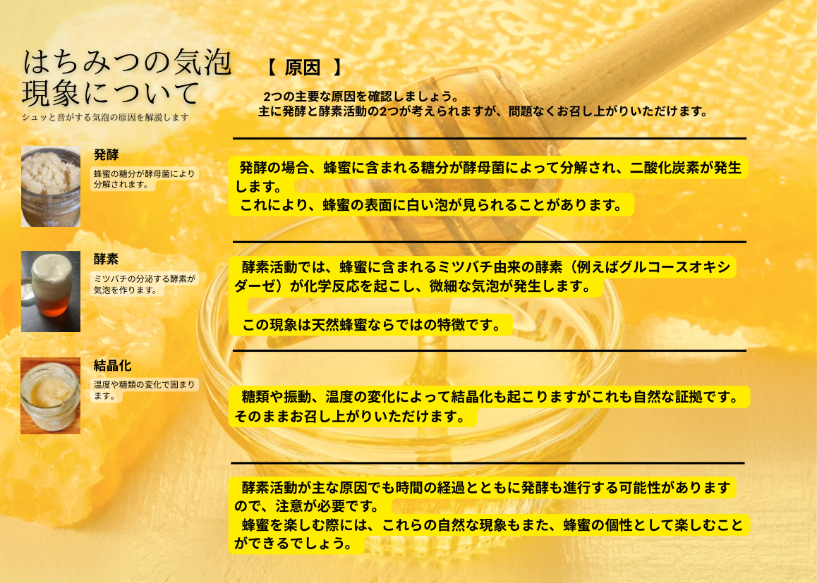 ※100%純粋はちみつのため、白い泡や黒い粉が混じっている事がありますが、品質には問題ありません。また、温度が低くなると白く固まりますが、品質に問題なく食べれます。